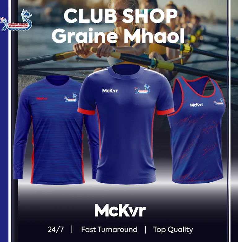 The Gráine Mhaol Dragon Boat Shop will be open the season (no closing date as of yet). All items can be ordered online with a quick turnaround of within 2 weeks. Audrey has a set of size 12 in the new items if anyone would like to try them on. Audrey describes the sizing as ‘true to size,’. The colours are bright and vibrant, all in our club colours across the tee, vest, singlet and technical top — and the quality is really lovely. …….Happy shopping!